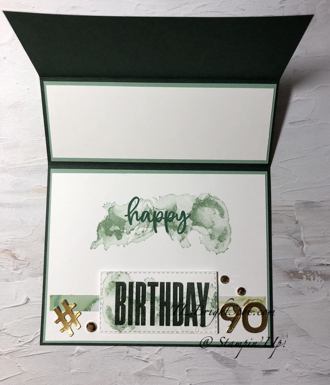• With the Basic White inside panel, stamp the ‘splotch’ with Mint Macaron ink using the Artistically Inked stamp set.