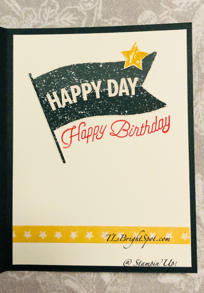 For the inside, I die cut another flag banner from the Hey Sports Fan 12 x 12 DSP and adhered it to a Very Vaniila piece 4 x 5 1/4). I stamped the sentiment using the Special Moments stamps set (NEW) making sure to bend it to follow the curve of the flag. This was stamped in Poppy Parade ink. I cut a length of stars from another piece of the Hey Sports Fan 12 x 12 and adhered it 1/2: from the bottom, then added the panel to the inside of the card. I added another larger fussy cut star (coated in Crystal Shimmery Effects) to the inside of the card, VOILA! the card is done!