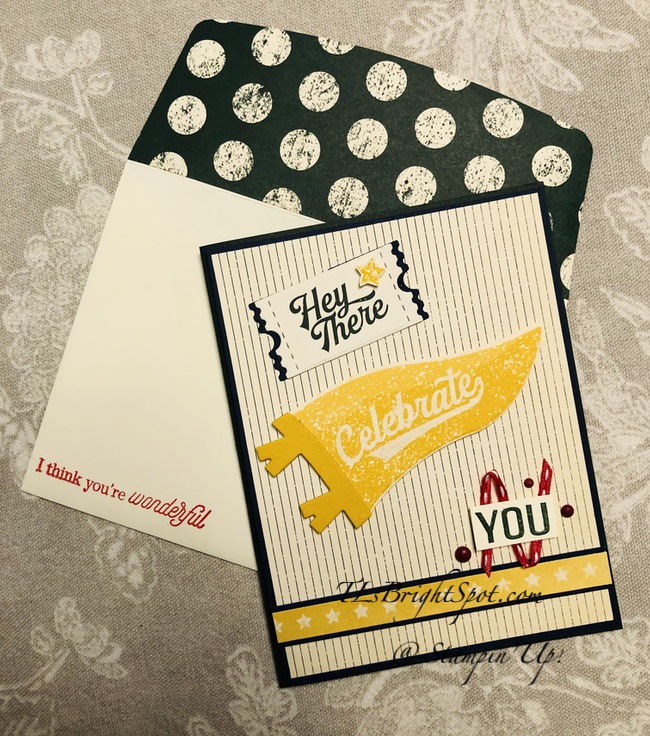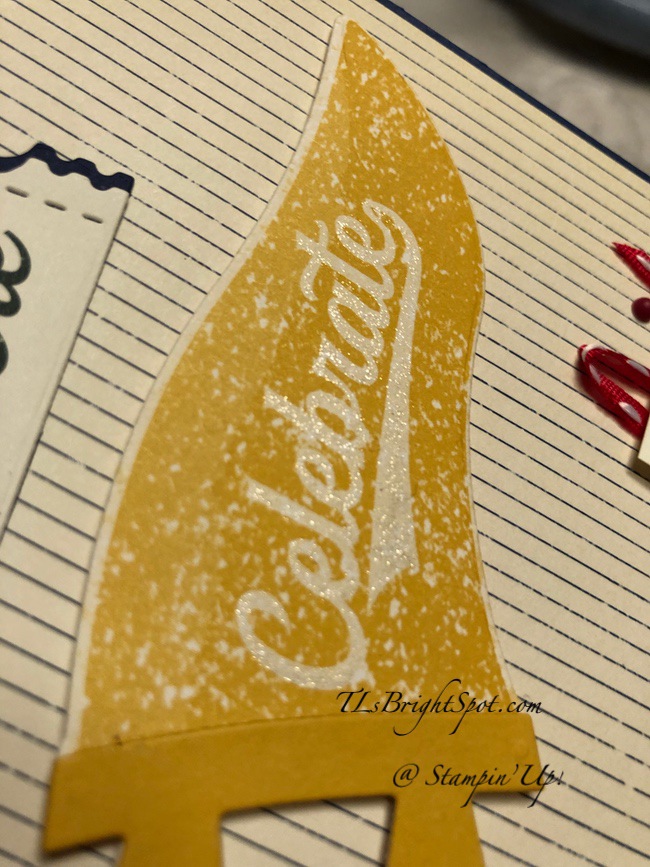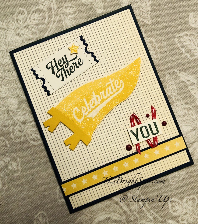 The background DSP is from this Hey Sports Fan 12 x 12 DSP. The ‘ticket and flag banner are die cut from one of the papers using the Sports Event Dies. The stars I fussy cut and added Shimmer Crystal Effects for a bit more shine and dimension. You can clearly see I die cut the ticket twice: once from the Hey Sports Fan 12 x 12 DSP, and the background for that from Night of Navy card stock. I cut the Night of Navy piece in half and adhered it to the Hey There ticket with liquid glue. I added the star with a dimensional once it was dry from the Crystal Effects. The flag banner was die cut from a piece of the Hey Sports Fan 12 x 12 DSP, then an additional piece was added die cut in Bumblebee card stock, I took the Wink of Stella pen and covered the word with it to extra glam.