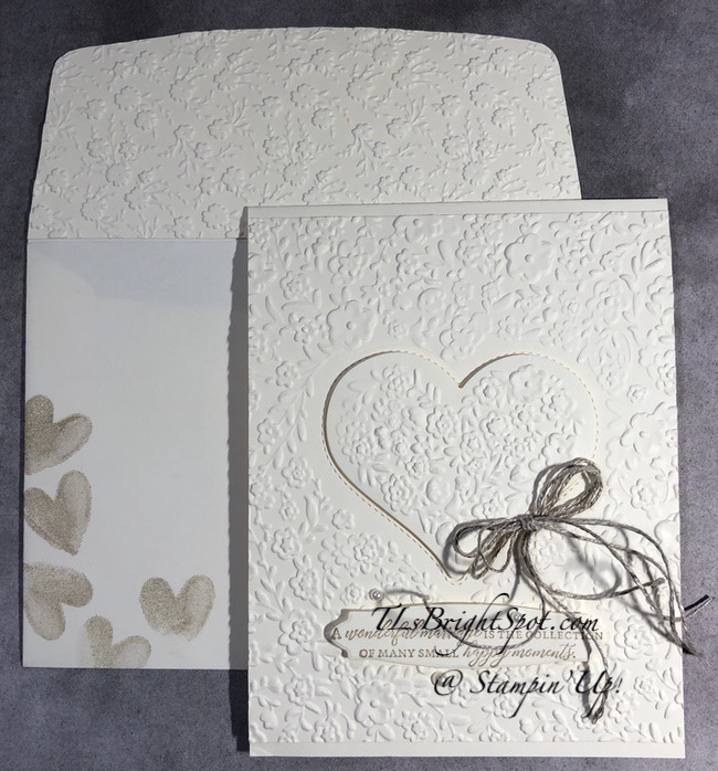 For the envelope, I took a piece of Very Vanilla card stock and embossed it with the Ornate Floral 3D embossing folder, adhered it to the flap with liquid glue and trimmed to fit. On the front I randomly stamped more of the hearts from the Sweet Conversations stamp set in Sahara Sand ink. This is just so elegant – love everything about it. Hope you like it as well.