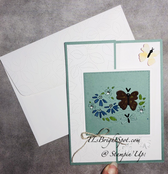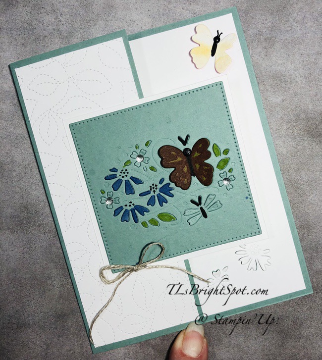 For the inside… Cut a panel of Basic White 4 x 5 1/4. Run the panel through the Cut & emboss machine with some of the small flower dies and a butterfly from the Pretty Pop-Ups Dies. Color the butterfly lightly with Soft , adding the body with Black Stampin’ Write Marker, then antennae. Stamp the sentiment in Soft Succulent ink using another NEW PRODUCT – Charming Sentiments stamp set. (This has a coordinating die set but I did not use it for this project.). Adhere the panel to the inside of the card & d-o-n-e!
