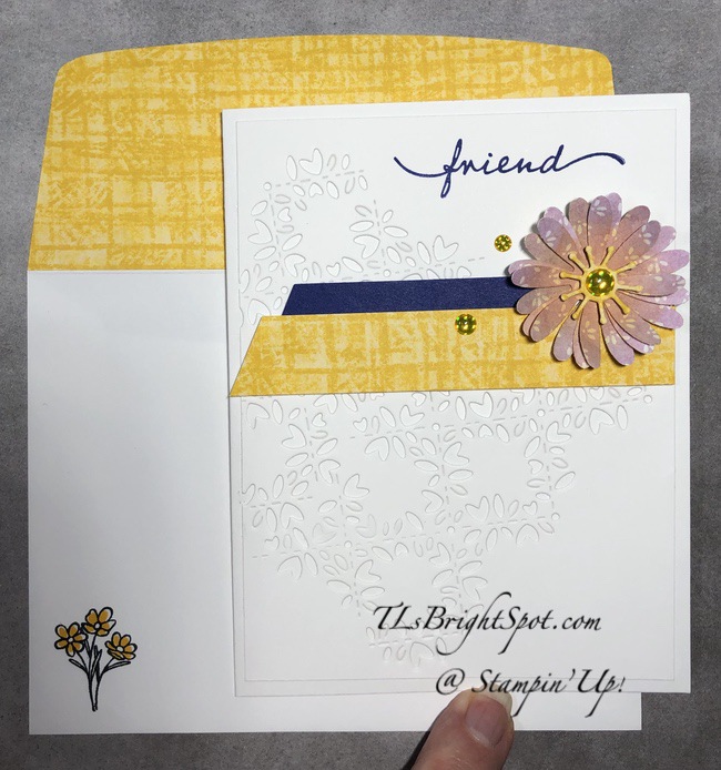 The Tea Boutique 6×6 DSP has some beautiful papers in it. I decided to use the ‘back side’ for the daisy using the Fresh Fresia design and the Daffodil Delight design for the crosswise banner. I think it pulls everything together. For the center of the flower, I used a die from the Poppy Moments Dies, then popped a Glossy Dots Assortment in the Daffodil Delight for the flower center and two other dots.Here’s the step by step…
