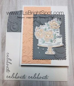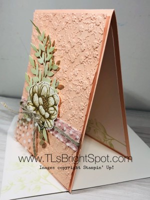 Adhere this embossed panel to Petal Pink cs cut to 4 1/4 x 11 and scored at 5 1/2. Your card front is complete! Easy peasy…
