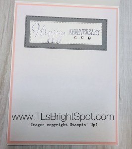The inside… Stamp the sentiment of choice on a scrap of Whisper White. Here I used the happy from Happy Birthday To You stamp set and the anniversary from the Well Said stamp set. They were stamped in Versamark ink then heat embossed with Silver Embossing powder. I used the Stitched Rectangle dies to cut both a Whisper White and a Smokey Slate piece and adhered with liquid glue to a Whisper White (4″ x 5 1/4″). This was adhered with liquid glue to a Petal Pink (4 1/8″ x 5 3/8″) and all adhered to the card base with liquid glue. Inside… done!