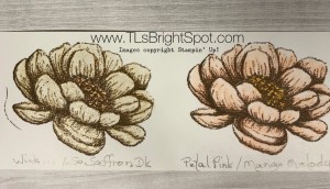 For the inside… I was playing around with color for the flower… stamped the outline stamp on a Very Vanilla scrap in Calypso Coral but colored this one with Stampin’ Blends 1000 & 500. The 1000 is the pinkish color and the 500 is the soft shade of brown. After die cutting the flower & adhering it to a Very Vanilla insert, I added a single Pearls of Beauty embellishment in the Crumb Cake kind of color. The top sentiment is stamped in Early Espresso using the Words of Beauty stamp set. The lower sentiment is stamped in Petal Pink ink using the Sweetly Scripted stamp set.