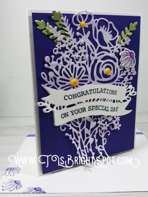 Die cut the bouquet using the Banner Blooms Dies and Playing with Patterns of 6×6. Add Wink of Stella to the very small daisy like flowers, then wherever else suits you. It’s easier to do this before adhering but you can certainly add more later. Adhere very loosely with liquid glue to the Gorgeous Grape card base ~ in the banner area and a couple of places in the upper portion.. Notice in the picture the bottom half of the bouquet is not adhered at all. Stamp the banner with Memento Black ink on Whisper White and die cut using the Banner Blooms Dies. You will need to trim the excess. I wanted the extra little ‘tufts’ at the ends of the banner as I liked them :). Use a bone folder to soften the paper to make it bend and curl a bit. Adhere double dimensionals in the center only and glue dots near the ends, but allow the ends to curl up.