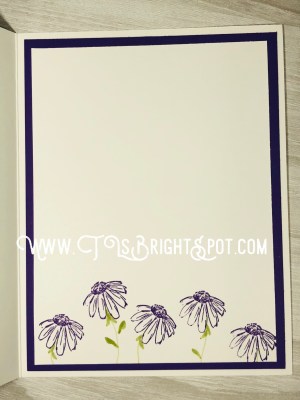 Let me say – I love this little daisy! It is just cute, cute, cute… I stamped it in Gorgeous Grape several times across the bottom of the Whisper White panel. I then added stems and leaves with a Pear Pizzazz marker. This was adhered to a panel of Gorgeous Grape with liquid glue then added to the inside of the card, again with liquid glue.