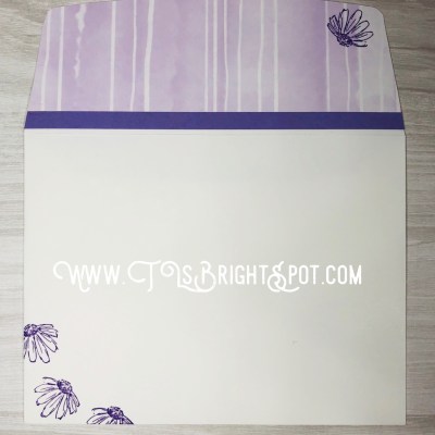 For the envelope I covered the flap in a remnant of the Playing with Patterns 6×6paper and added a strip of Highland Heather, then I stamped the cute daisy, again with Gorgeous Grape.