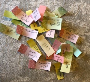 Hello Readers! Sending Christmas cards has been one of those responsibilities that was once a chore… Why is it not a chore now? I make all my own cards of course and what is fun is to lay them all out on the table (they are all different as mass producing is just not my thing). Next I review my list of folks to whom we send cards. I write each name on little sticky notes and then comes the fun – who gets each card? It brings a smile to my face as rarely when I’m making Christmas cards do I think of who is to receive it. Putting those little sticky notes on each card is like a little prayer of thanks for that individual or family. I have to share part of my pile of sticky notes once the cards were addressed – ‘cuz I didn’t think of it until late that this might be a fun thing to share.