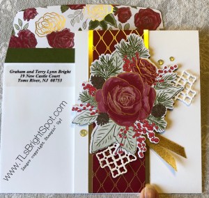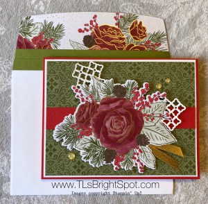 This second card is portrait style: Thick Whisper White card base, 1 1/2″ strip of DSP from the suite with gold foil on each edge: same lattice style diecut separated, ribbon and embellishments – all from the suite.