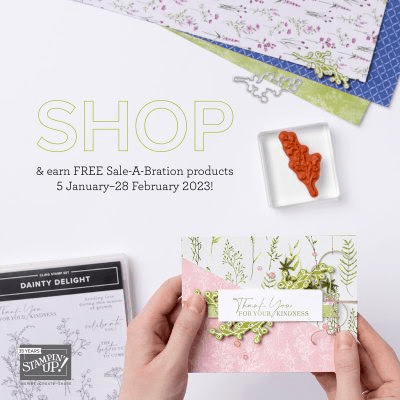 And here’s another thing to consider when joining during this time period – during Sale-a bration for every $50 increment of purchase you receive FREE Stampin’ Up! product from the Sale-a-bration Catalog. You can order product from the current 2022-2023 Annual Catalog or from the Jan-April 2023 Mini Catalog and still get that same FREE product during Sale-a-bration. And this Jan-Feb for Sale-a-bration is the ONLY Sale-a-bration this year!!! Don’t forget that when joining, you automatically receive a 20% discount on all Stampin’ Up! products.