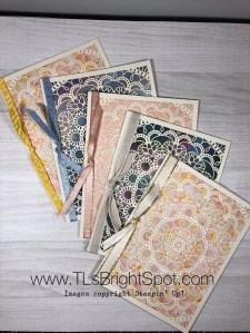 The last 3×3 card is the Zinnia 3D embossing Folder embossed on Basic White and adhered. I tied a bow from the 2022-2024 In Color Bakers Twine and adhered it with a glue dot. The sentiment was again stamped in Melon Mambo ink on Basic White and fussy cut with paper snips, adhered with dimensionals. More Adhesive-Backed Shiny Sequins were added to the front for glam. The inside of the card got the rest of the sentiment adhered with liquid glue; the envelope more of the Flowering Zinnias 12×12 DSP on the flap. And done…