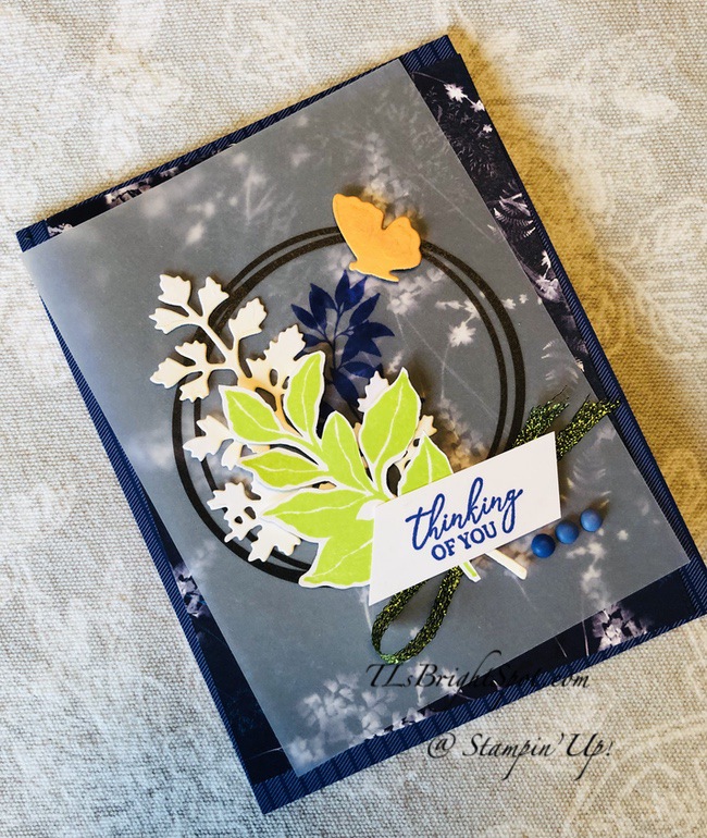 I began with a card base of Starry Night card stock and adhered a panel of the 6 x 6 DSP Assortment in Starry Night. I then cut a piece of Sun Prints 12 x 12 (there are some gorgeous patterns in the pack!) and adhered it cockeyed, intentionally :O) I stamped the leaf design from the Botanical Layers stamp set in Orchid Oasis ink, kind of a purpley blue and heat set it with the heat tool to help it dry.It WILL dry on it’s own, but it will take a bit and I didn’t want to wait. I die cut the leaves from the Meadow Dies (coordinates with Quiet Meadow stamp set) and Basic White card stock then used a Blending Brush and Pale Papaya ink to gently add color. I also die cut the butterfly from the same Meadows Dies and Pale Papaya card stock then used the same Blending Brush to add more color to the butterfly. I added the white branch of leaves to the card with glue dots. I stamped the additional leaves on a Basic White piece in Parakeet Party ink and fussy cut it. This was an easy process by the way… I added this over the white leaves with dimensionals. I cut a length of Parakeet Party Metallic Ribbon and slipped it under the green leaves, adhering with a glue dot. I stamped the sentiment from the Botanical Layers stamp set in Orchid Oasis ink and trimmed the Basic White strip as you see it. A single dimensional under the right section of the sentiment and a dab of liquid glue on the left adhered it to the card. Two final touches: add the butterfly with mini dimensionals, then add the 2022-2024 In Color Matte Dots in Orchid Oasis. And the card front is complete.