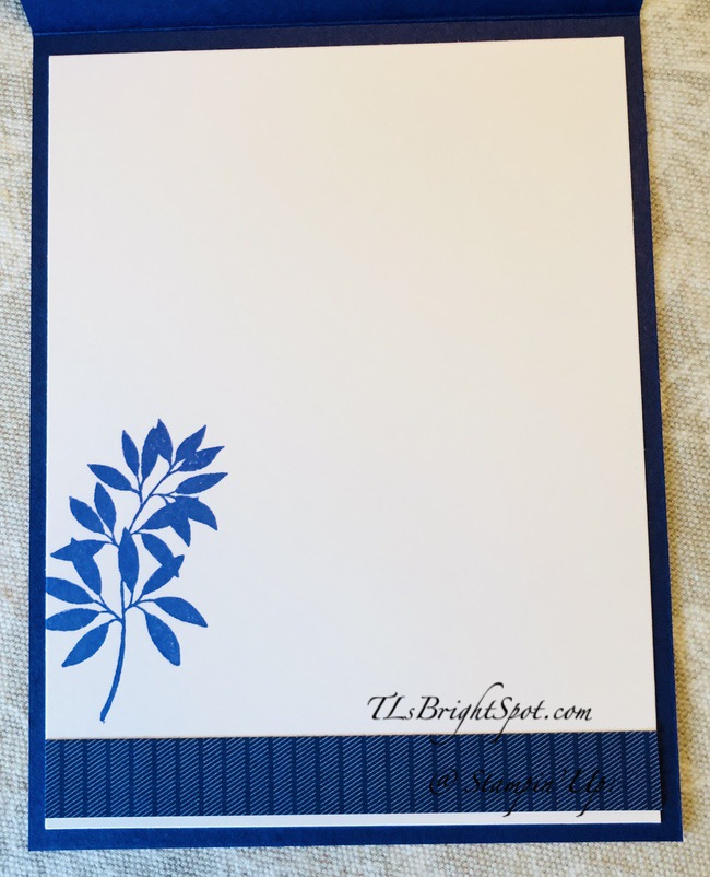 For the inside… I stamped & die cut this wonderful image in Secret Sea ink and was originally going to use it on the front, then decided not to use it. When it came time to do the inside, I decided to0add the die cut (Gallery Blooms Dies) to the 4 x 5 1/4 Basic White panel. And done!