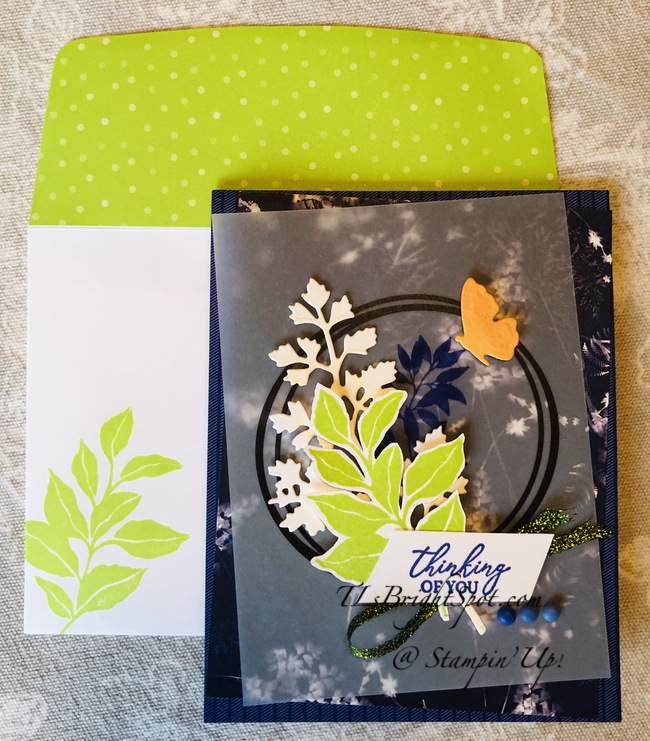 For the envelope, I stamped the leaves in Parakeet Party ink on the front of the envelope using the Botanical Layers stamp set. To the flap I added 6×6 DSP Assortment in Parakeet Party and trimmed it to fit. Done, done!