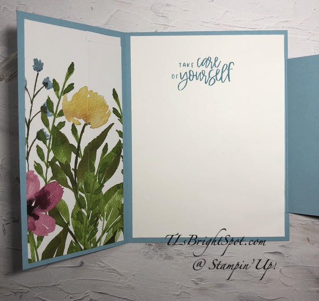 Didn’t this turn out sweet? It looks very similar to the ‘envelope bouquet on the DSP! The leaves were all adhered with dabs of liquid glue while many of the flowers have mini dimensionals on the back to create depth – even though it’s the inside of the card. This is probably my favorite part of this card ~ the inside.