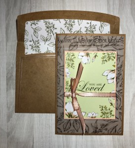 The envelope got special treatment with a piece of Abstract Beauty 4 x 6 DSP adhered to the flap and trimmed to fit. I stamped the butterfly right on the DSP using the Butterfly Brilliance stamp. First I inked with Coastal Cabana, then picked up the Pacific Point and inked just the lower wings. You could easily do this with a sponge dauber but I was lazy and just used the ink pad.