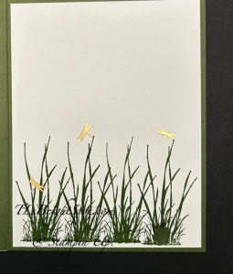 For the inside of the card, I stamped this grassy image four times across the bottom with Mossy Meadow ink. And yes, the stamp comes from Prairie Grass stamp set. I added three more of the Adhesive-Backed Dragonflies as they are very flat and so appropriate for this grassy scene. I adhered the Basic White panel to the inside of the card and voila – this card is ready to send.