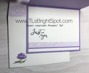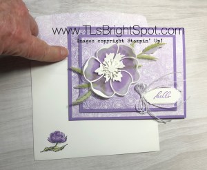 - Card stock layer is Highland Heather (8 1/2″ x 5 1/2″ scored at 4 1/4″), with DSP from Best DressedĀ 6 x 6 DSP. (4″ x 5 1/4″). Adhere the DSP with liquid glue to the Highland Heather card base.