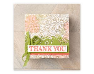 The layout for these two cards is exactly the same, I just used different papers from the DSP pack and a circular laser-cut piece vs a rectangular laser-cut. It’s wonderful how different these two are and yet so similar. The sentiment comes from Path of Petals stamp set for both cards. For the card on the left, I used a 2″ circle punch to create the circle and stamped leaves in Pretty Peacock ink using the Forever Fern stamp set. You also see Pear Pizzazz card stock outlining the DSP. On the card at right I used leaves from Touched My Heart stamp set and stamped in Soft Sea Foam ink, same as the card stock behind the DSP. I embellished both cards with Metallic Pearls.