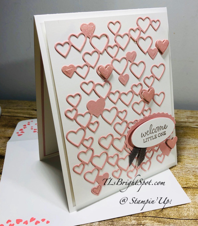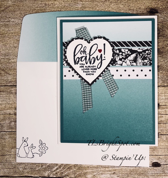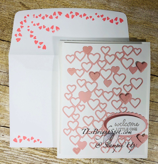 I stamped the heart stamp from the Oval Occasions stamp set in Flirty Flamingo and this set is ready to be sent to a friend who just had a bay girl. LOVE that I can create and send right away.
