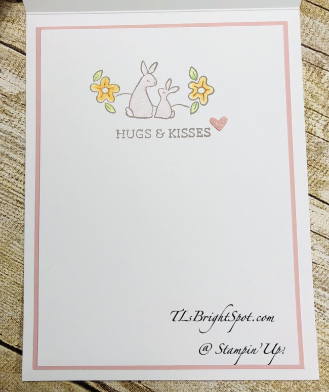 I stamped the bunny/floral image in Gray Granite ink on a Whisper White panel. I colored it using the ‘fun to use’ Watercolor Pencils and Blending Pen: Flirty Flamingo for the bunnies (lightly), Granny Apple Green for the leaves then shaded with Garden Green, Daffodil Delight for the flowers and shaded with Pumpkin Pie – each blended with the Blending Pen. This really smooths the pencil lines and blends the shading nicely. I added Wink of Stella to the bunnies. I then stamped the sentiment in Gray Granite ink. The heart was added from one of the leftover hearts from the Detailed Hearts Die. I simply peeled the adhesive backing and put it right on the card. Adhere this Whisper White panel to a piece of Blushing Bride with liquid glue then add to the inside of the card, again with liquid glue. Voila – the card is finis!