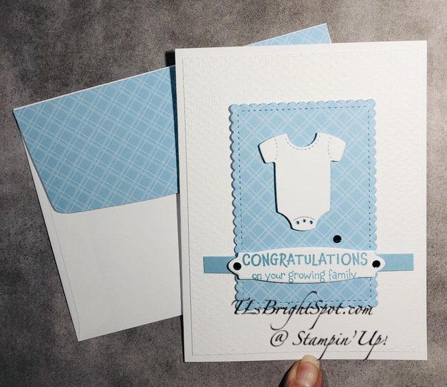 For the envelope, more of the Subtles 6×6 DSP in Balmy Blue was added to the flap and trimmed to fit. This added touch just unifies every project – love this! And there ya go… a baby boy card for a new little one.