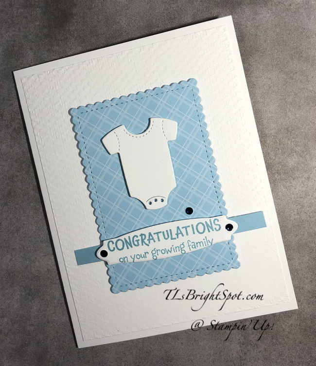 My card today uses the All For Baby stamp set with its coordinating Baby Clothes Dies. I confess… this was my first play with this bundle ~ and I loved it. The individual requesting the card said it should be simple, for a new grandmother and the baby was a boy. Sounds easy enough, right? And it was!