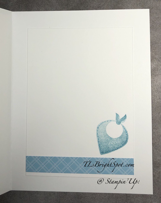 For the inside of the card, I stamped the onsie with Memento ink on a piece of Subtles 6×6 DSP (Balmy Blue of course) and while die cutting, I also die cut the pocket for the onsie. I adhered it directly to the Basic White inset (4 x 5 1/4) then stamped the sentiment in Azure Afternoon ink and the hearts too. This was attached to the inside of Balmy Blue card base for the completed card.