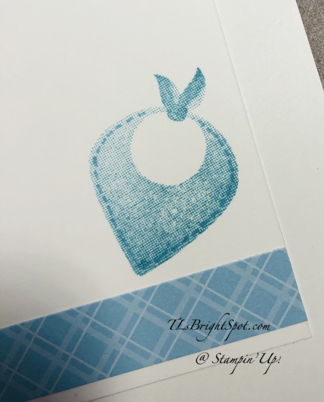 I stamped the bib from All For Baby stamp set in Balmy Blue, then took a Balmy Blue Marker and with the fine tip, made little stitch marks. They barely show but I know I did it!