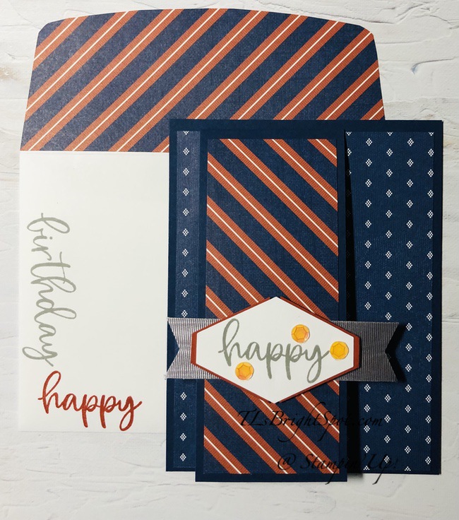 For the inside, Starry Sky ink on the Biggest Wish stamp set ‘happy’, stamped on the Basic White panel. Then the 4th was stamped in Berry Burst ink using the Alphabest stamp set. A 1/2″ strip of the Stargazing DSp was added to the bottom to continue the theme from the front. In hindsight, it should have been adhered to the top of the Basic White panel – but you know, hindsight. This piece was added to Berry Burst and adhered to the inside of the card.