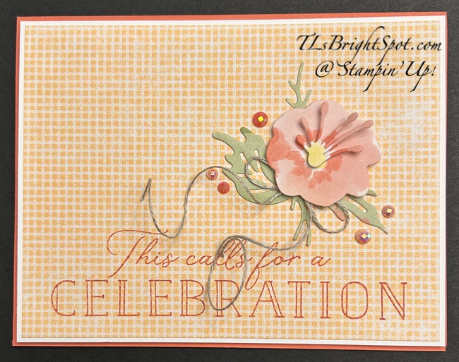 I began with a Fresh Freesia card base and added two layers of the Lovely & Beautiful Special DSP, off-setting them for the challenge and attached them with dimensionals. I then pulled out Petal Pink to die cut the two flower pieces and Gold Foil for the stems & leaves. I used a sponge dauber & Calypso Coral ink to add dimension to the flower centers. Using the Beautifully Celebrated Dies, I also die cut the sweet label under the flower from Basic White and used the same sponge dauber to sponge the edges. I stamped the sentiment in Petal Pink ink and fussy cut along the bottom. This was attached with dimesnionals. Final touch… the awesome Pearlized Faceted Circles. Let me explain the flower layers a bit more… I added the two petal layers with a single cut in half mini dimensional, but it didn’t quite ‘sit’ the way I wanted, so I rolled a glue dot and attached that to one of the petals and it did the trick. The gold foil stamen is added with a glue dot.