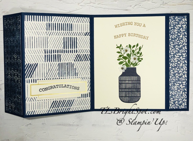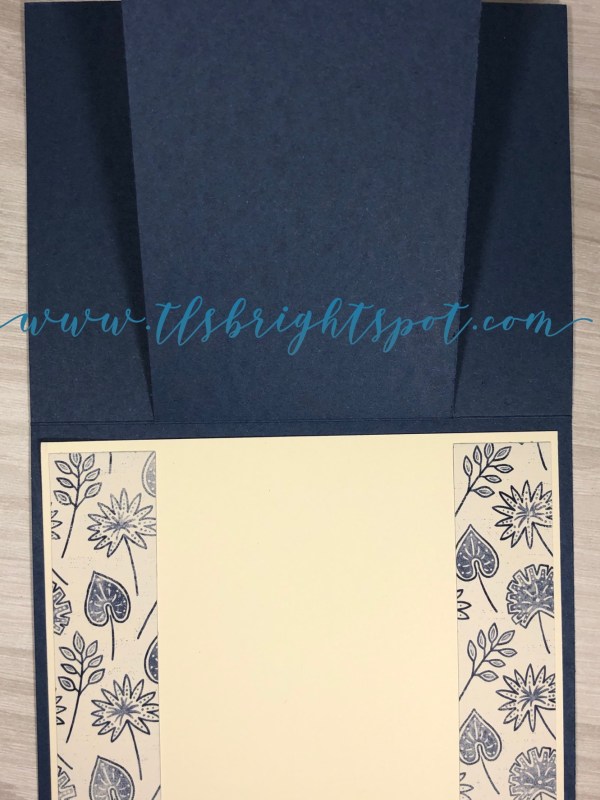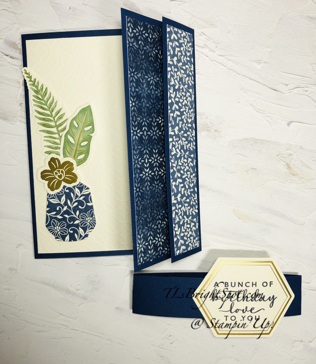 Just creating the folds leaves all kinds of possibilities for what to do next, but here’s what i’ve done. I used one of the Very Vanilla embossed pieces in the 6×6 DSP pack and adhered it to the front of the card with liquid glue. I went ahead and decorated it at this point: die cut a vase with one of the Boho Indigo dies. I put dimensionals on the back and adhered it so it would show when the front flap was closed. I adhered the big palm fronds with liquid glue, then the other larger leaf with liquid glue on the lower stem and a dimensional on the upper part of the frond. I added a gold flower sticker also with dimensionals and that part was done. Next I added all the cut strips with liquid glue (card cuts are at the bottom of this post). My last step was the Very Vanilla panel for the inside.