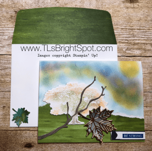 The belly band is 1″ x 12″. You may find when you gently wrap it around the card, that it needs to be shortened a bit. Do that before adhering together with snail. Then decorate the belly band. I used the beautiful whisper white 5/8″ Flax Ribbon found on page 174 in the annual catalogue and adhered that also with snail. Using the Gathered Together stamp set (pages 47 & 48 in the Holiday catalogue), I stamped that gorgeous large leaf and colored it with several stamping blends: Pretty Peacock, Granny Apple Green and just a hint of Cherry Cobbler. (see the full range of colors available in the Annual Catalogue on page 179. I then cut it with the Gathered Leaves dies (pg. 47 HC) and adhered with snail.