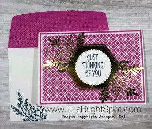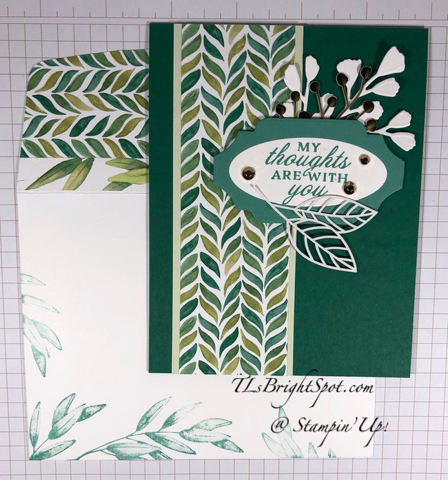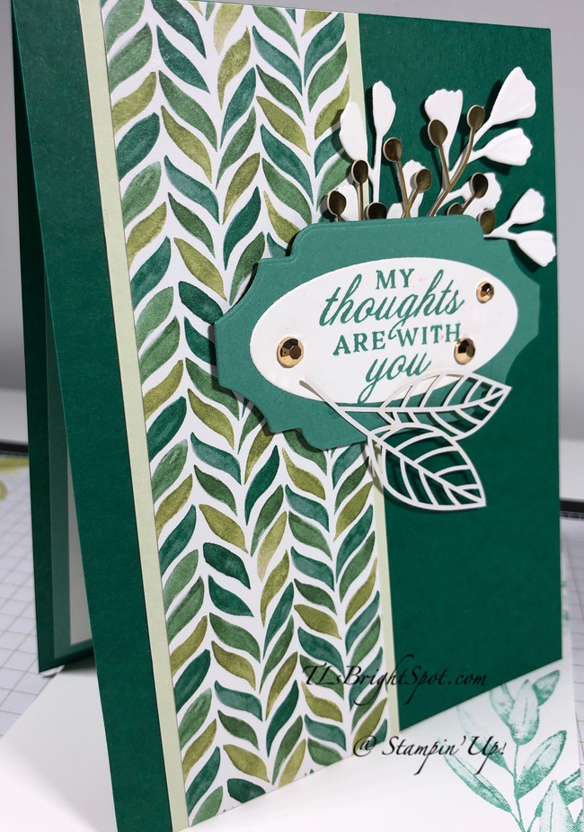 The layout for these two cards is exactly the same, I just used different papers from the DSP pack and a circular laser-cut piece vs a rectangular laser-cut. It’s wonderful how different these two are and yet so similar. The sentiment comes from Path of Petals stamp set for both cards. For the card on the left, I used a 2″ circle punch to create the circle and stamped leaves in Pretty Peacock ink using the Forever Fern stamp set. You also see Pear Pizzazz card stock outlining the DSP. On the card at right I used leaves from Touched My Heart stamp set and stamped in Soft Sea Foam ink, same as the card stock behind the DSP. I embellished both cards with Metallic Pearls.