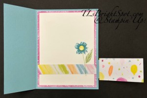 Envelope… Coordinating DSP on flaps were added & trimmed to fit. On the front O stamped that sweet small flower and colored each as described above for the individual card. Creating two cards at once was really easy & fun as well. Same layout just different colors.