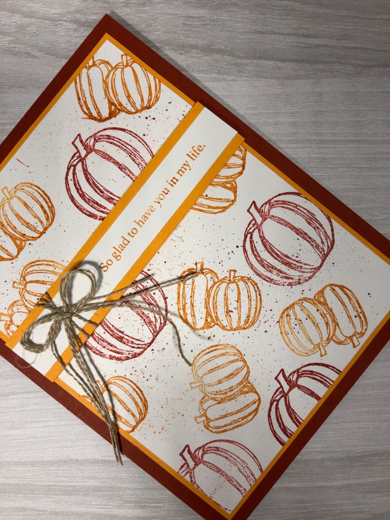 - Stamp the larger pumpkin randomly in Cajun Craze ink on a Whisper White panel. I recommend stamping at least five times, maybe seven but always an odd number of times.