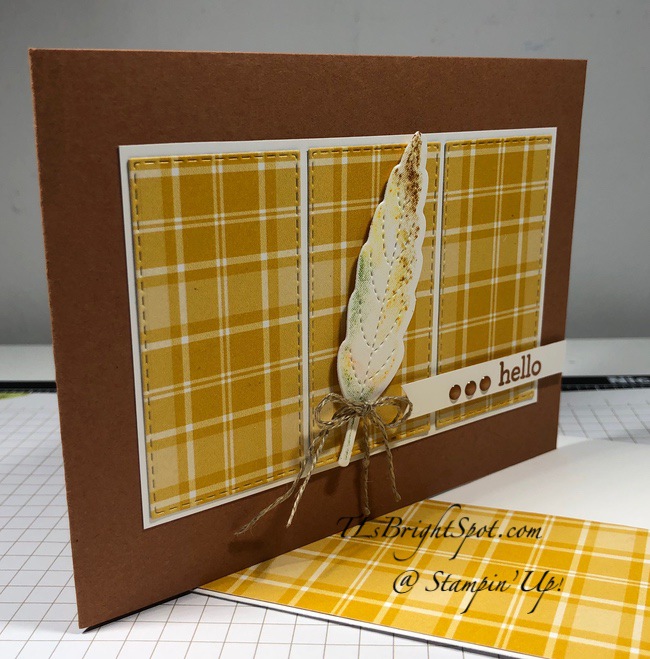 The card base is Mossy Meadow with a layer of Darling Duckling then a layer of Painterly Pears DSP. Next I die cut the Basic Beige with the Branching Out dies and added it. With another piece of the Painterly Pears DSP and the Perfectly Pears Dies, I die cut the two pears and the stem/ leaves. Using another die in the Perfectly Pears Dies and Lemon Lime Twist, I die cut the open weave image. I adhered the stem/ leaves to each pear, then attached them to the card front: the darker pear is adhered directly and the lighter pear is on dimensionals. I slipped the open weave die cut under the pears and attached with dabs of liquid glue. The leaves of the darker pear do have dimensionals. Once everything was innplace, I stamped the sentiment in Mossy Meadow ink. It comes from the Perfectly Pears stamp set. Final touch – three Low Profile Sparkle Dots in Old Olive and a double Linen Thread bow added with a glue dot.