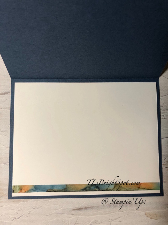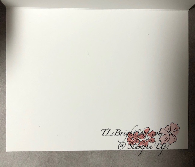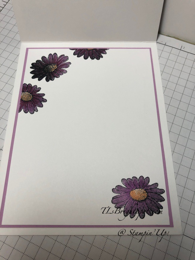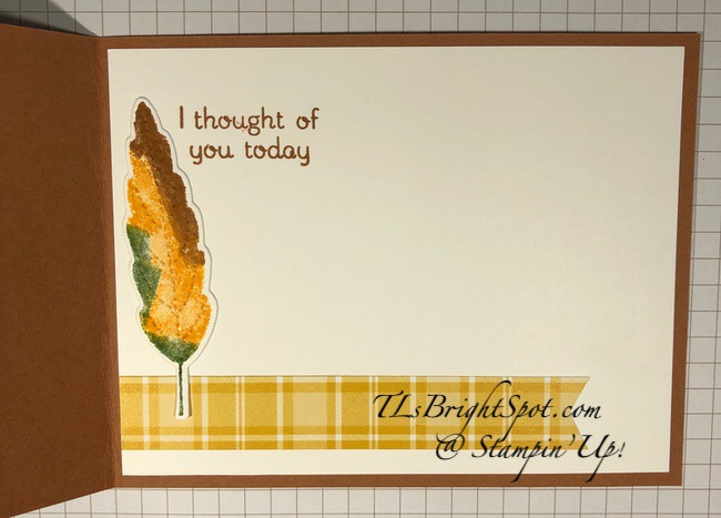 For the inside…on a panel of Basic White… the pear comes from the Perfectly Pears stamp set… inked first in Darling Duckling then Lemon Lime Twist added with a sponge dauber and stamped on the panel. The stem’ leaves are also from this stamp set and are inked with Old Olive and Early Espresso Markers. This was attached to aDarling Duckling panel then added to the inside of the card.