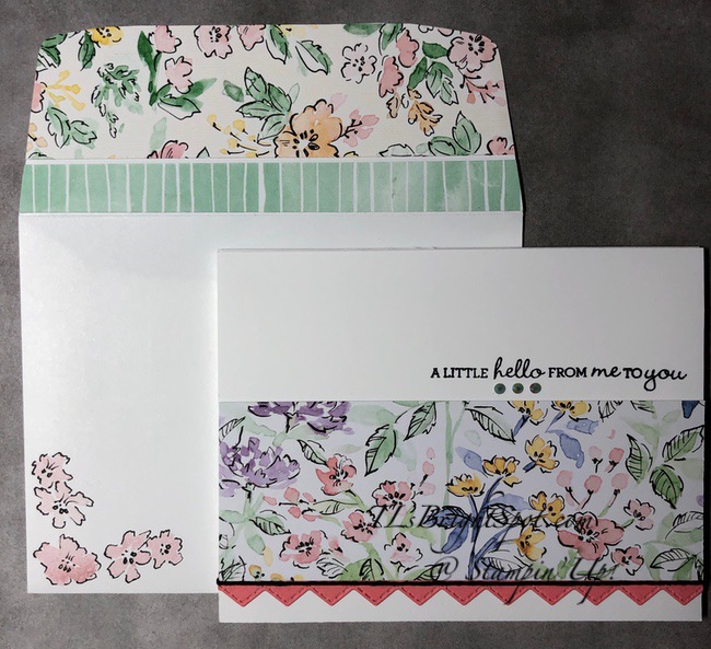 For the envelope… The same Painterly Pears DSP was added to the flap & trimmed to fit. The pear was stamped using the same method as above – using the Perfectly Pears stamps, Darling Duckling and Lemon Lime Twist inks for the pear and Old Olive and Early Espresso markers for the stem’ leaves. This is such a fabulous suite of products!