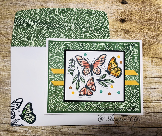 Cover the envelope flap with more of the Flower & Field DSP and stamp the front of the envelope with the word bubble in Memento Black ink and the word in So Saffron. Both come from the Snailed It stamp set. Voila!