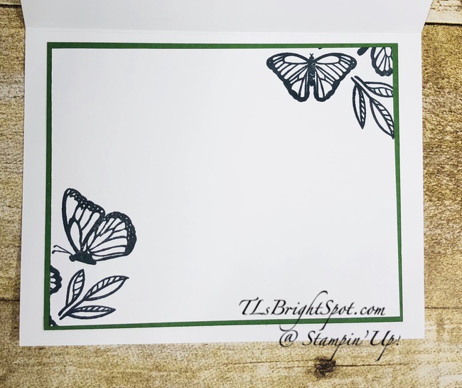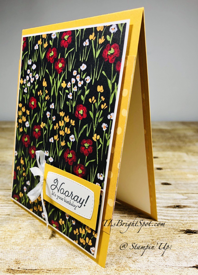 I have a fun fold for you today – one using more of the Flower & Field DSP that’s FREE w/ a $50 purchase during Sale-a-bration. You will see more use of this fold as it’s just so easy. I first saw it on a video by another demonstrator, Patty Bennett. I’ve created mine in a landscape position while hers was all portrait. Nevertheless, it works the same – and here’s my card.