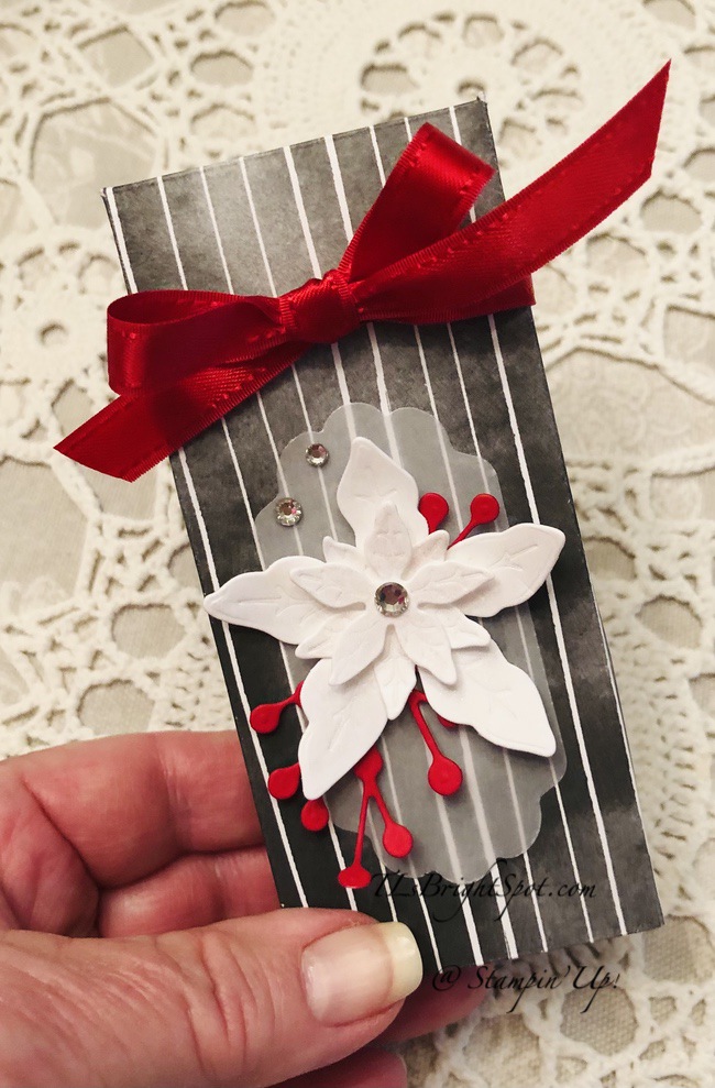 I couldn’t help it… I just HAD to make a card to go with the cute gift box from yesterday… It is super simple. The Striped paper is from the Beautifully Penned 12 x 12 DSP that is FREE during Sale-a-bration with a $50 order. The other main products are the Scalloped Contour Dies and the Poinsettia Dies. I also used two different embossing powders for a modern-type look (goes with the stripy paper, don’t you think so?) Black Embossing Powder for the sentiment on the front of the card (from Poinsettia Petals stamp set) and White Embossing Powder for the poinsettias on the inside of the card and front of the envelope (also from the Poinsettia Petals stamp set.) And the plus one is the red ~ Real Red card stock for the berries & background papers & the Wonderful Gems in red.