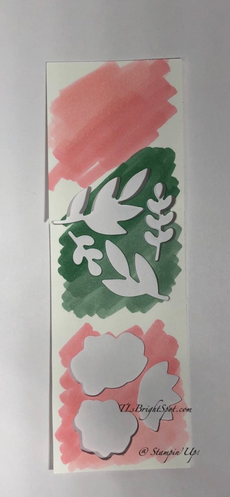 - On a piece of Basic White, rub the piece with the embossing buddy to remove finger prints or anything that would cause the embossing powder to attach itself; stamp the hearts from Country Bouquet stamp set with VersaMark ink; sprinkle with silver embossing powder and heat set with the Heat Tool. Once cool, punch with the Country Bouquet Punch and set both hearts aside.