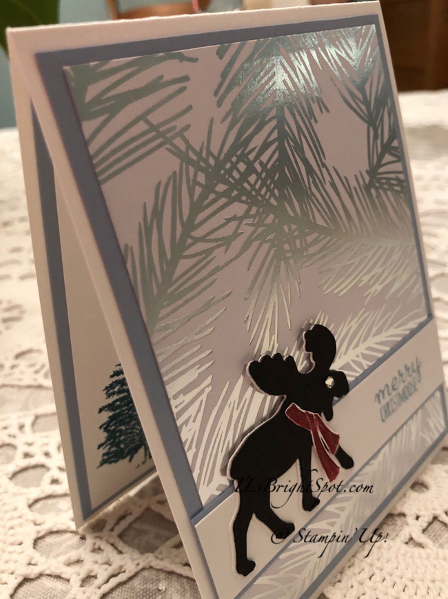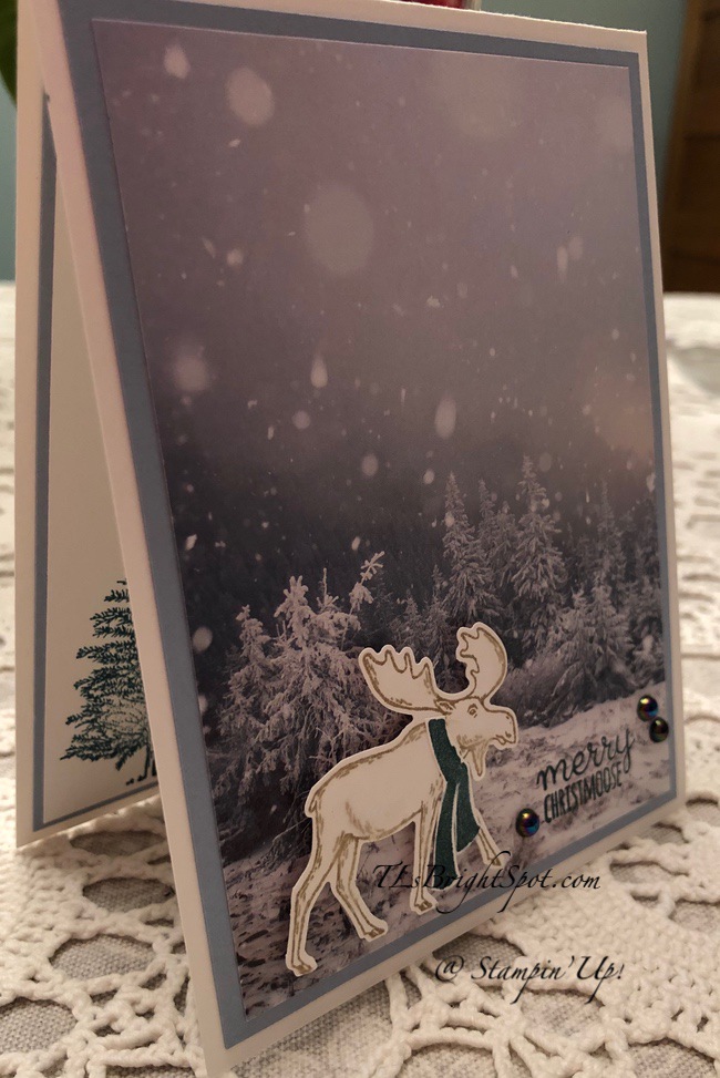 Today’s card is just so sweet – and yet it is also masculine. It would be perfect for a man for just about any occasion, but I have chosen it to be a Christmas card. The Merry Moose stamp set and coordinating Moose Punch are a carryover from last years catalog – and I love the sentiments and images in this set.