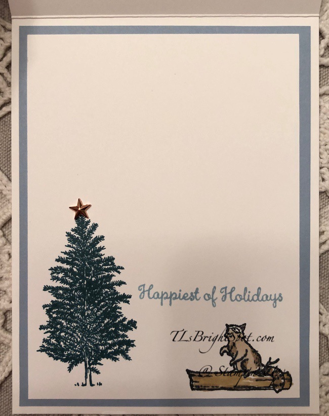 For card 2 inside I again stamped the tree in Pretty Peacock ink then stamped this cute raccoon on a log in Tuxedo Black Memento ink and colored it with Stampin Blends: Crumb Cake combo pack and the log with light Crumb Cake and ______. For an added touch I added a fun Star Element to the tree top, which the raccoon is watching with awe. The sentiment was stamped in Seaside Spray ink.