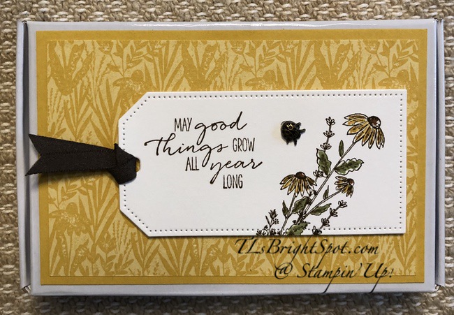 And here’s the box, a mini Paper Pumpkin box, that I decorated on the top. I used Crushed Curry card stock topped with the Harvest Meadow DSP which I love. I then cut a tag using Basic White card stock and the Tailor Made Dies. I stamped the beautiful wildflower spray and the sentiment using Garden Wishes stamp set and Early Espresso ink. I colored the flowers with markers: Bumblebee, Highland Heather, Pear Pizzazz and finally Soft Suede for the flower center. I added a Faux Suede Ribbon in Early Espresso and the cute little Ladybug Trinket, mounted it on dimensionals and added it to the mini box.