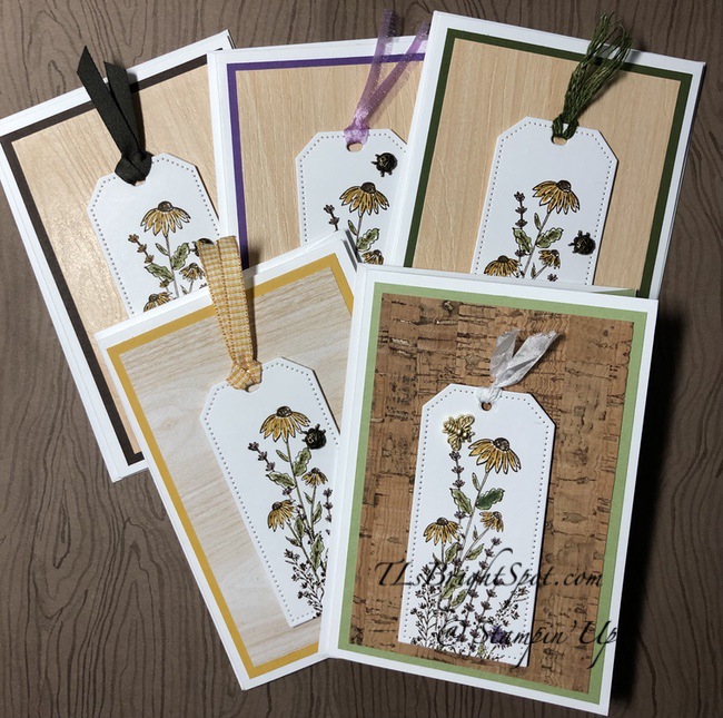 Several days ago I shared a note card with cork and mentioned that this card needed to be repeated and shared in a gift box. Well, I finally got to it… and made the additional four cards you see below. (In lieu of the cork, I used In the Woods DSP and various different card stock bases: Early Espresso, Gorgeous Grape, Crushed Curry, and Mossy Meadow. I also used various ribbons, some current and some not, and in lieu of the cute little bumblebee trinket, I used a retired Little Ladybug. The current ribbons used were Faux Suede in Early Espresso, Gingham Ribbon in Bumblebee and finally sheer ribbon in Fresh Freesia.
