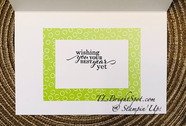 - Stamp the sentiment in Granny Apple Green ink on a scrap of the Artistry Blooms DSP and cut with the Classic Label Punch. I separated mine, but you wouldn’t have to. The sentiment comes from the A Wish for Everything stamp set.