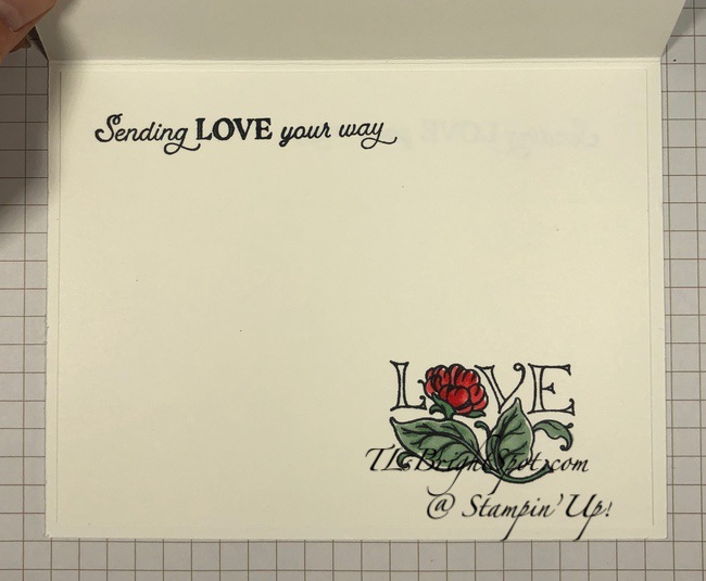 - I colored a panel of True Love DSP 4 x 6 then trimmed it to 4 x 5 1/4, removing a portion from each end. I used those trimmings on the inside of the card, which you will see in a bit.